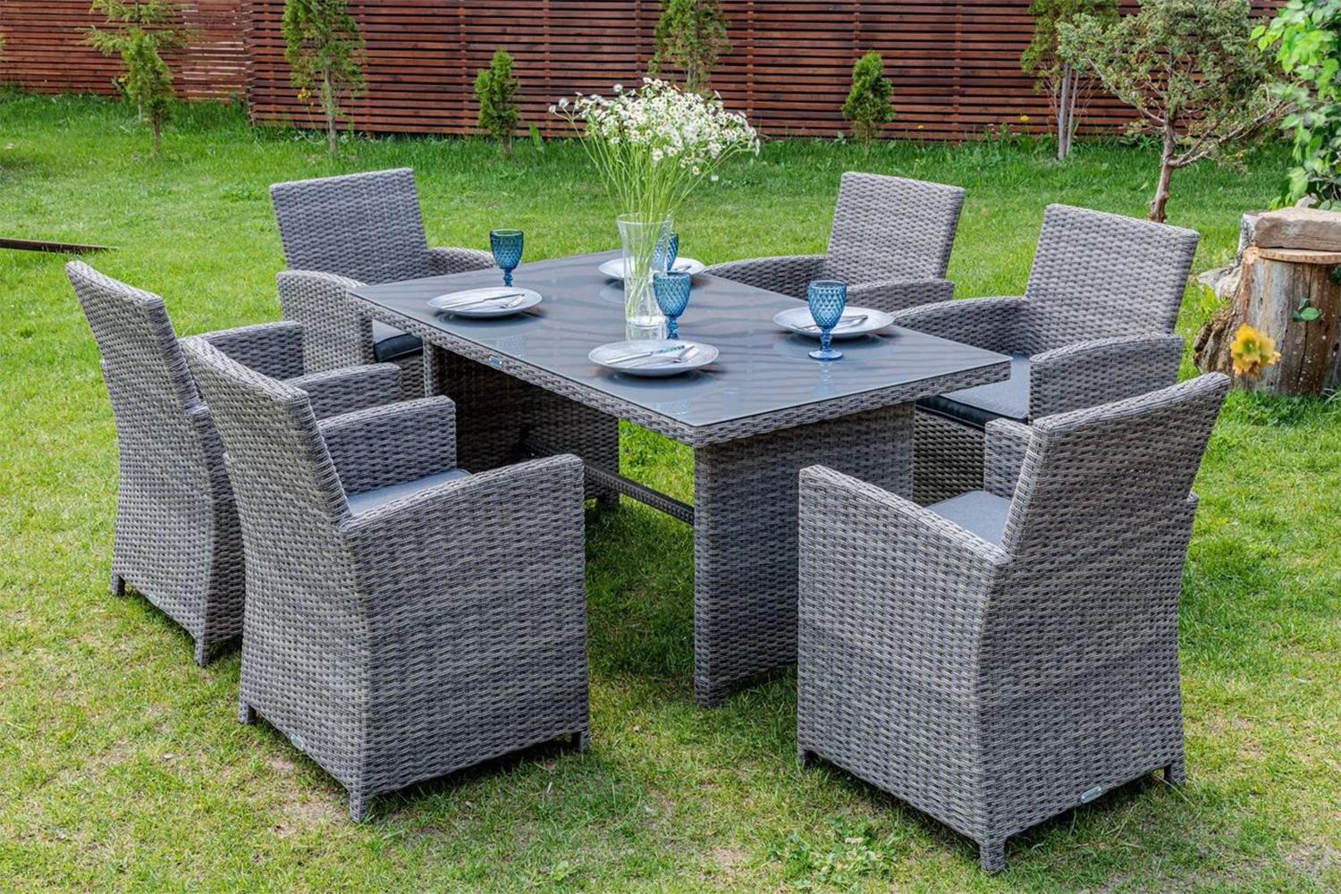 Серый цвет – универсальный оттенок для обустройства любого пространства. На природе, когда хочется наслаждаться только окружающей погодой, не хочется обставлять пространство отдыха яркими цветами, и серый комплект Фиона для этого отлично подойдет. В таком комплекте сможет разместиться до 6 взрослых людей, которые смогут насладиться полноценным обедом. В набор входят 6 кресел размером 58х89х60 см и просторный обеденный стол 160х74х90 см. такой набор может быть поставлен как на улице, так и в тепле помещения – дизайн и материалы отлично позволяют сделать это.